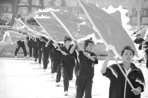 昨天上午,在周口市区五一广场,周口三通少林文武学校的学员正在认真彩排,迎接由周口日报社举办的即将开幕的“周口首届大型车展”。晚报记者 朱海龙 摄
