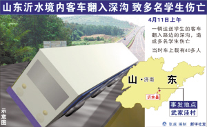 据新华社电 4月11日9时30分左右,山东省淄博市张店区铝城第二中学组织师生乘车赴沂蒙山区,途经沂水县沂水镇后庞家庄处,在下坡时因路面湿滑坠入路右边深沟内,发生翻车。事故造成3人当场死亡,2人送医院抢救无效死亡,2人重伤,37人轻微伤。