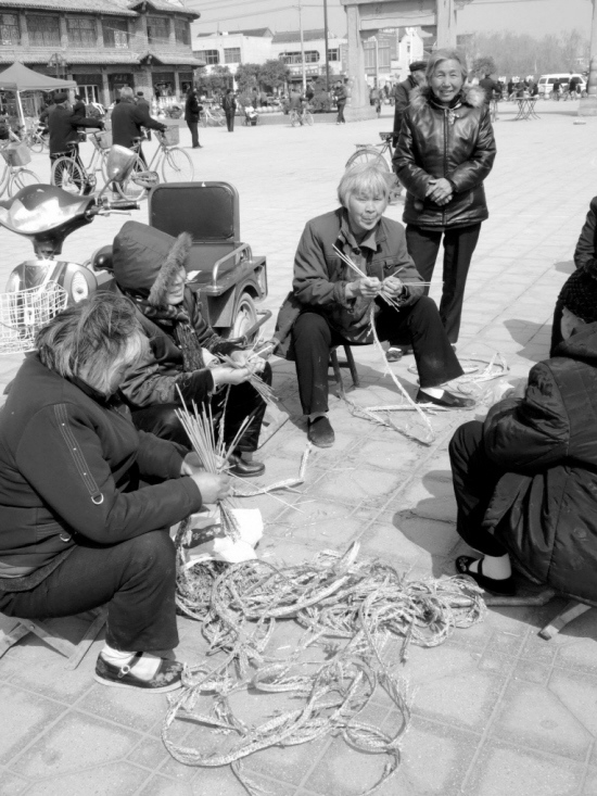 编草帽辫历来是鹿邑县的传统工艺。在该县老君台广场,经常有一群老年人边聊天边编草帽辫,每人每天可收入10余元,既锻炼了身体,又增加了收入。 (王羡荣 摄)
