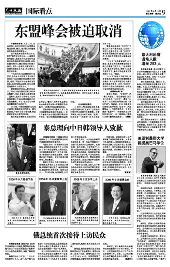 路透社报道,“红衫军”的“幕后大老板”、前总理他信·西那瓦已经致电“红衫军”,感谢“红衫军”当天对总理阿披实的“施压行动”。报道说,在11日晚曼谷总理府门前举行的“红衫军”大规模集会上,他信打来电话,言语中感谢“红衫军”“为泰国民主而牺牲休息时间”,称“继续耐心等待几天便可赢得某些改变”。(周薇)