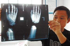 4月12日上午,记者在该院6楼显微科的病房里,见到了8岁的楚楚。他正安静地躺在病床上看电视,双手和左臂上包着厚厚的纱布,接好的双手颜色发红。医生让楚楚动一下指头,楚楚说“能动,不过有些疼、也有些麻”。记者看到,孩子皱着眉头使了使劲,接好的双手真的能稍微动一动。