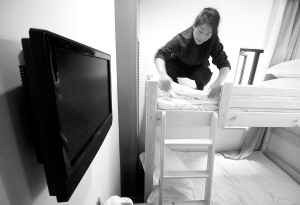 4月13日,在位于上海市中心的一家“袖珍旅馆”,工作人员在打扫一间双人房。据悉, 一种新型“袖珍旅馆”即将亮相上海市中心。“袖珍旅馆”房间面积在7平方米左右,设有上下铺,有独立卫生间,每晚房价在100元左右,主要用以满足上海世博会期间来沪的国内外“驴友”和年轻人的需求。 新华社发