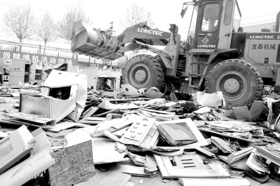 4月14日,在济南市公安局集中销毁赌博机活动现场,工作人员操作大型机械销毁赌博机。当日,济南市公安局举行集中销毁赌博机活动,将今年以来在清理整治中收缴的赌博游戏机463台及电路板136块全部销毁。新华社发