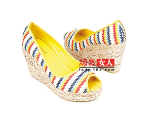 复古时尚的条纹装饰鱼嘴鞋,搭配草编楔型跟,简单大方好搭配,又能修饰腿部线条,让尝试高跟鞋的初学者穿起来更加稳健好走。