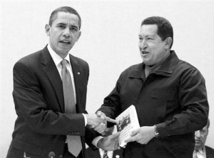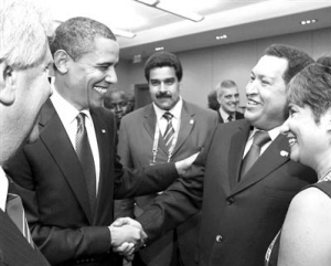 委内瑞拉政府稍后公布的照片显示,奥巴马右手握住查韦斯右手,左手搭住对方右臂,两人面带微笑,神态轻松。