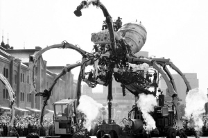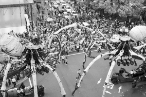 4月19日,一家法国公司制作的高12米、重37吨的巨型机械蜘蛛在日本港口城市横滨街头表演,庆祝横滨开港150周年。