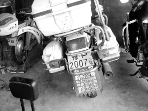 记者到市区七一中路周口市保安服务公司采访时发现,该公司院内停有多辆车身喷有“执勤和出警”字样,安装有警灯,但未挂车牌的执勤车。一位不愿透露姓名的男子悄悄告诉记者说:“听说最近有督察组来周口,所以领导安排把自制车牌卸下来,过一段时间再装。”但在该公司的车棚里,记者还是发现了该公司为摩托车自制的“豫P2007保”车牌(图一)。