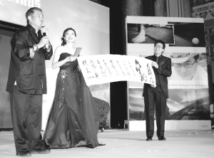 4月25日,著名笑星赵本山(左)为新加坡乒乓女将李佳薇(中)及其丈夫李超送上墨宝和新婚的祝福。当日,李佳薇与丈夫李超在北京饭店举行婚礼。 新华社 发