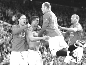 4月25日,曼联队球员克·罗纳尔多(左二)进球后与队友贝尔巴托夫(左一)、鲁尼(右二)和费迪南德庆祝。当日,在2008-2009赛季英格兰足球超级联赛第34轮的比赛中,曼联上演精彩大逆转,在上半场0比2落后的劣势下,在下半场的22分钟内连进5球,最终5比2大胜托特纳姆热刺队,向夺取英超三连冠又迈进一步。