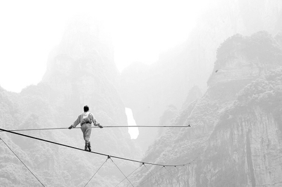 4月25日,赛买提·艾山在高空钢丝上行走。当日,新疆达瓦孜传人赛买提·艾山第二次挑战天门山并获得成功。 新华社发 新疆达瓦孜传人 天门山挑战成功