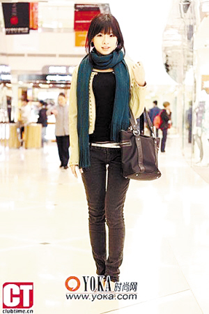 不同浓度的绿色层次分明,非常精致的面庞,搭配厚重的毛线围巾怎能不让人眼前一亮!绿色的深浅混搭突出层次。