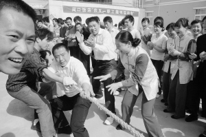 昨天,周口饭店举行“庆五一职工趣味运动会”。图为员工拔河比赛。