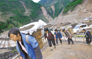 4月28日,四川省青川县红光乡的村民用背篓运输沙子等建筑材料。四川省青川县红光乡几位平均年龄50岁左右的村民用背篓运输沙子等建筑材料,在东河口地震遗址建设工地上辛勤工作,为重建家园贡献自己的力量。
