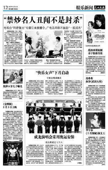 本报综合消息 日前,国家广电总局对于“绯闻明星”再下禁播令——严禁炒作名人丑闻、绯闻、劣迹。广电总局相关负责人在接受记者采访时表示,有的电视台把“阿娇复出一周年”当作一个事件来炒作,是不被准许的。