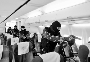 4月28日,参加演习的武警官兵登上“被劫持”飞机。当日上午,为提高机场应急救援保障水平,武汉天河机场举行反恐演习,模拟歹徒劫持客机后迫降在天河机场,武警、公安、医疗等多部门联合参加。