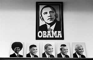 5月4日,在美国洛杉矶的一家理发店内摆放着印有美国总统奥巴马不同发型头像的图像。这家理发店为了吸引顾客,别出心裁地通过电脑制作出一些奥巴马不同发型的头像。(张新 摄)