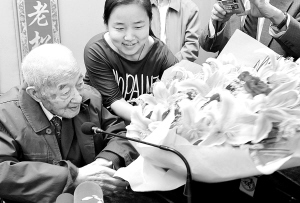 5月6日,学生向郑集教授献花。当日,我国抗衰理论研究奠基人、南京大学教授郑集喜度109周岁生日。郑集教授是我国生物化学和营养学研究的先导者之一,在多年的科研和教学生涯中,取得了丰硕的学术成果,为国家培养了大批人才。目前他是南京市最长寿的男性老人。 新华社发