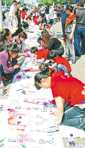 5月6日,鹿邑县紫气大道中段北侧的人行道上,青少年和母亲们在共同绘画。为弘扬中华民族敬老孝道传统美德,构建和谐社会,当日,鹿邑县妇联组织举办了“爱中华母亲”青少年百米长卷书画展。广大书画爱好者浓墨重彩,讴歌伟大母爱,并祝福天下所有母亲。