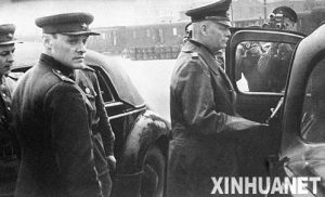 1945年5月7日,法西斯德国宣布无条件投降。这是1945年5月8日,德国陆军元帅、最高参谋长凯特利(右)代表德国前往签署德国无条件投降书的资料照片。