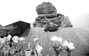 青川东河口地震遗址公园纪念广场,黑色大理石碑上镌刻着近5000名青川遇难者的姓名。大理石碑边的几米远处,有个小亭子,后面有一顶帐篷,这里的主人叫何先通,他是纪念广场的守望者。这里地面下100多米的地方是何先通原来房屋所在的位置。图为何先通在地震遗址公园擦拭墓碑。新华社发