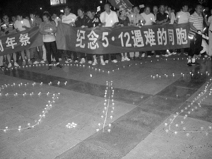 当晚8时许,祈福仪式开始,大家围在蜡烛的四周为地震中遇难同胞默哀1分钟。随后,大家共同唱起《祝福》、《团结就是力量》等歌曲,用歌声寄托哀思、遥寄祝福。