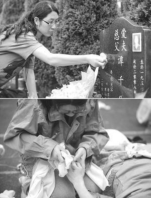 5月9日,在四川德阳市汉旺镇东汽集团厂区,谭千秋的妻子张关容和女儿仙子朝东汽中学的旧址走去。3个月后,东汽中学将搬到新校舍,张关容和女儿也将住进新家。一年前地震发生时,东汽中学教师谭千秋在教室坍塌的一瞬间,奋力将4个学生拥到课桌下,学生得救了,而谭老师却永远地离开了。小图:在德阳市的龙井公墓,张关容仔细地擦去丈夫墓碑上的灰尘。