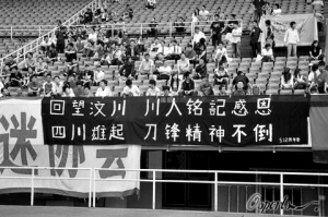 上周末的中超联赛各个赛场,纪念汶川地震周年活动已经悄然展开。图为成都谢菲联主场迎战广州医药的球赛中,为了纪念5·12地震过去一周年,四川赛区邀请了在抗震救灾中有突出贡献的消防官兵、武警官兵,医务工作者、以及地震幸存者来观看这场比赛。球迷也是在看台上打出横幅,“回望汶川,川人铭记感恩”,让人心中有一股热浪在流淌。甘慧 摄
