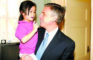 洪博培夫妇共有7个孩子,其中5个是亲生儿女,2000年,洪博培夫妇在中国领养一名被遗弃的女婴,取名格雷茜·梅。2006年他们又收养了一名印度女孩。 (赵帆)