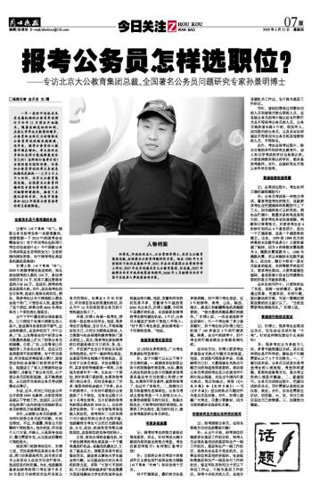 一年一度的中央机关及其直属机构的公务员考试预计于今年11月前后开始报名。随着金融危机的加剧、应届大学毕业生数量的增多、公务员职业吸引力的增强及公务员考试的越来越便捷,近年来,报考公务员的人数每年都在增加。考生面对众多职位怎样才能选择最适合自己的?怎样制订备考计划?当前的国内国际形势,对参加公务员考试的考生来说是机遇还是挑战……5月9日上午9时许,北京大公教育集团总裁、全国著名公务员问题研究专家孙景明博士在郑州短暂停留期间,接受了本报记者的专访,为我市准备参加2010年国家公务员招考的考生答疑解惑。