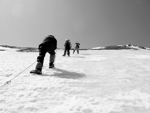 为避免滑坠,每走一段距离,他们就在地面上打上一个节点,进行必要的保护措施。遇到极端危险的亮冰区,5个人便用绳子结组而行。结组而行,使得他们成为“一条绳上的蚂蚱”,一旦一个人滑坠,其他4个人也会跟着滑坠。因此,在这段路程中,4位驴友都保持沉默。他们都在小心翼翼地爬自己的路,谁都不想因为自己的疏忽而导致大家前功尽弃。