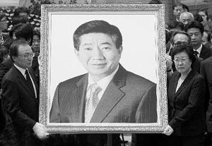 上图:5月24日,卢武铉任内的两位总理李海瓒(前左)和韩明淑(前右)手举卢武铉的遗像进行哀悼。