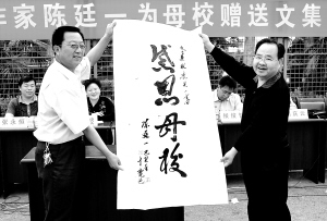 5月28日,我国传记文学的扛鼎作家、素有“南叶北陈”(上海的叶永烈)之称的陈廷一(右一)再次回到阔别已久的母校——鹿邑县第一高级中学,为母校赠送文集,并题写“感恩母校”赠言。