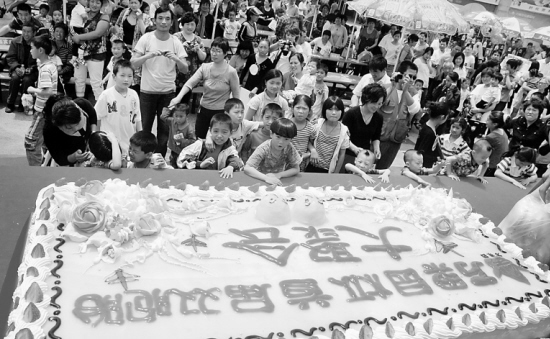 看着大蛋糕,孩子们脸上乐开了花。 晚报记者 李寒 摄