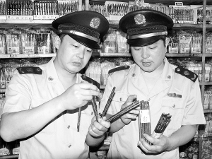 从检查情况来看,尚没有发现假冒伪劣产品。有两种中华2B铅笔外观上看不一样,但都是真品。其中一种外观呈深墨绿色,上面印有“中国第一铅笔”金色字体,笔杆上的英文是“中国制造”;另一种中华2B铅笔色泽要淡得多,虽然笔杆上也印有“中国第一铅笔”字体,可多出了“上海”两字,笔杆上的英文是“中国上海”。工商执法人员说,两种2B铅笔都是正宗2B铅笔,色泽较浅的2B铅笔为上海中国第一铅笔股份有限公司生产,深墨绿色2B铅笔为安徽蚌埠联营厂生产。