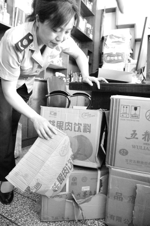 执法人员走进一酒类经销商店检查时,发现几件外包装显示是桃果肉饮料的“果汁”和一些名酒堆放在一起。执法人员打开“果汁”的外包装一看,里面是茅台、五粮液、剑南春等名酒的包装,共有53瓶“名酒”。经初步鉴定,这些都是假冒产品,执法人员当场予以暂扣,并将做进一步鉴定。此外,执法人员还查获了多件涉嫌商标侵权的蓝带啤酒。