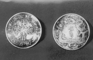 宣统三年“大清银币”除壹元、二角、一角曾普遍流通外,伍角银币是样币,在市场上流通的数量极少。笔者这枚伍角银币(右图)正面上沿为“宣统三年”,下沿为“二枚换一圆”,两侧为花枝,中间珠圈内为汉文“大清银币”4字,背面为立龙戏珠,中间为汉文币值“五角”,除包浆外品相完美,属古银币中的极美品。该币是近代龙图银币爱好者孜孜以求的珍稀品种。此币重13.4g,直径32.5mm,成色88%。以上两种银币均为清代标准银币,虽然因清朝灭亡未正式铸行,但从此开创了中国货币以“元、角、分”为单位的历史新纪元,推动了中国货币由“两”向“元”的过渡,也是中国近代货币制度走向现代货币制度的开端。