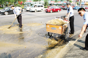 当日下午3时许,一位市民骑车拉着100升香油在交通路和邦杰路交叉口与一电动车相撞,油桶摔裂,近50升香油泄漏,形成一大片油污。骑车路过的市民接二连三滑倒在地。一些车辆来不及避让,车轮把油污扩大,油污最长处有30米。见此,值勤交警一面联系消防来进行清理,一面在现场指挥交通,避免有更多市民摔倒摔伤。