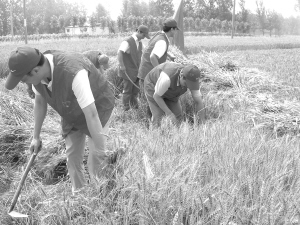 昨天,团市委组织近40名青年志愿者来到西华县城关镇朱园村帮助农户们收割小麦,并为该村每户贫困家庭送上300元现金和一些消暑用品。晚报记者 王丽丽 摄