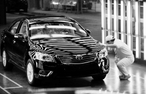广汽丰田汽车有限公司第一工厂内,一位工作人员正在检查一辆凯美瑞轿车。