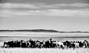 在拍摄大群牲畜时,要选择高角度。取景时最好把地平线放到画面的1/5处,甚至放到画面的边缘之处。切莫天空草地各占一半,为避免牧场给人以空旷之感,可有意识地将弯曲的河流、沼泽安排到画面之中,它不但能美化构图、丰富影调,还可给人一种水丰草茂、生机盎然的感觉。