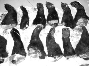 这是警方查获的部分走私熊掌。6月7日,广西警方破获一起特大走私案。一犯罪团伙将大量熊掌及其他走私物品藏在废纸中,运至防城港市时被警方抓获。经警方清点称量,共查获熊掌173只,重384.5公斤;巨蟒蛇皮4张,其中最长的达5米;另还有一只穿山甲。目前,案件正在进一步调查中。新华社发