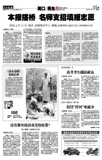 根据报社安排,“名师指导报志愿”活动将于6月11日8时30分开始,11时30分结束,参与方式一是拨打本报的高考咨询服务热线8289999、8261110、13949961110;二是可以直接到位于周口市区七一中路的周口晚报采访中心和名师面对面交流。另外,由于时间有限,请考生和家长把问题准备好以节省时间,给更多考生咨询的机会。