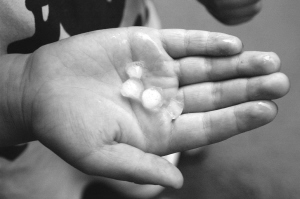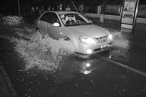 本报讯 昨天,大雨夹杂着花生仁大的冰雹从下午5时一直下到晚上10时,城区大面积积水。市政电力部门及时抢修泵站,排除涝情。