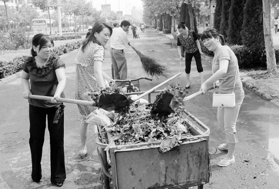 市公交公司员工自发走上街头清理被冰雹打落的树叶和枯枝。晚报记者 李寒 摄