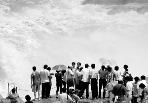 6月14日,游客在黄河壶口瀑布观赏“白浪滔天”的壮观场面。近日,受黄河上游降雨减少等因素影响,黄河水质明显变得清澈,在陕西延安宜川黄河壶口瀑布处形成“白浪滔天”的壮观场面,吸引了众多国内外游客前来观赏。