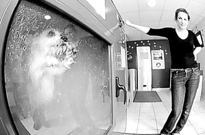 ▲现年31岁的法国人罗曼·雅里发明的这种自动洗狗机类似一个迷你洗车房,主人只需选定洗涤方式和宠物狗的大小尺寸,按下“开始键”后机器就会自动完成浸湿、冲洗和烘干等一系列过程。根据狗的大小费用也不同,小狗只需13英镑,中等大小的狗需要22英镑,体型较大的狗则要花31英镑。(林克)