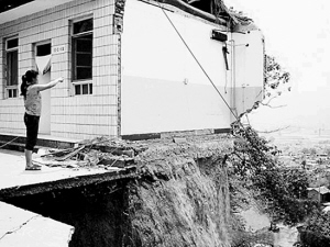 这排病房下面的水泥板上已出现明显裂缝,部分已悬空,露出两截水泥管道。5棵直径约0.5米的梧桐树也因垮塌翻落土崖下。