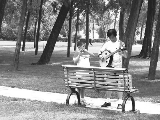 清晨的公园里,一对父子在练习乐器演奏,自得其乐。 摄影:郸城一高 王雪涛