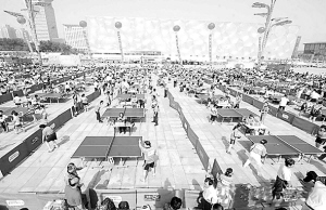 6月20日,北京市第七届全民健身节开幕式暨“和谐杯”千台万人乒乓球展示活动在奥林匹克公园景观大道举行,本次健身节将从即日起在全北京市范围内展开22项主题鲜明、形式多样的体育活动,一直持续到8月8日。此次“和谐杯”乒乓球赛从今年3月1日起启动,覆盖了北京市129个街道2523个社区和119个乡镇3957个行政村,参赛人数达到80万。新华社发
