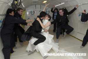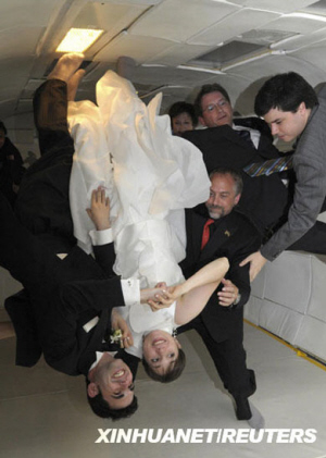 6月20日,来自美国纽约的诺厄·富勒莫和埃琳·芬尼根在一架特制的波音727型飞机上举行“零重力”婚礼。当天,这对新人搭乘这架飞机从位于佛罗里达州卡纳维拉尔角的肯尼迪航天中心出发,成为世界上首对在“零重力”状态下举行婚礼的夫妇。新华社/图